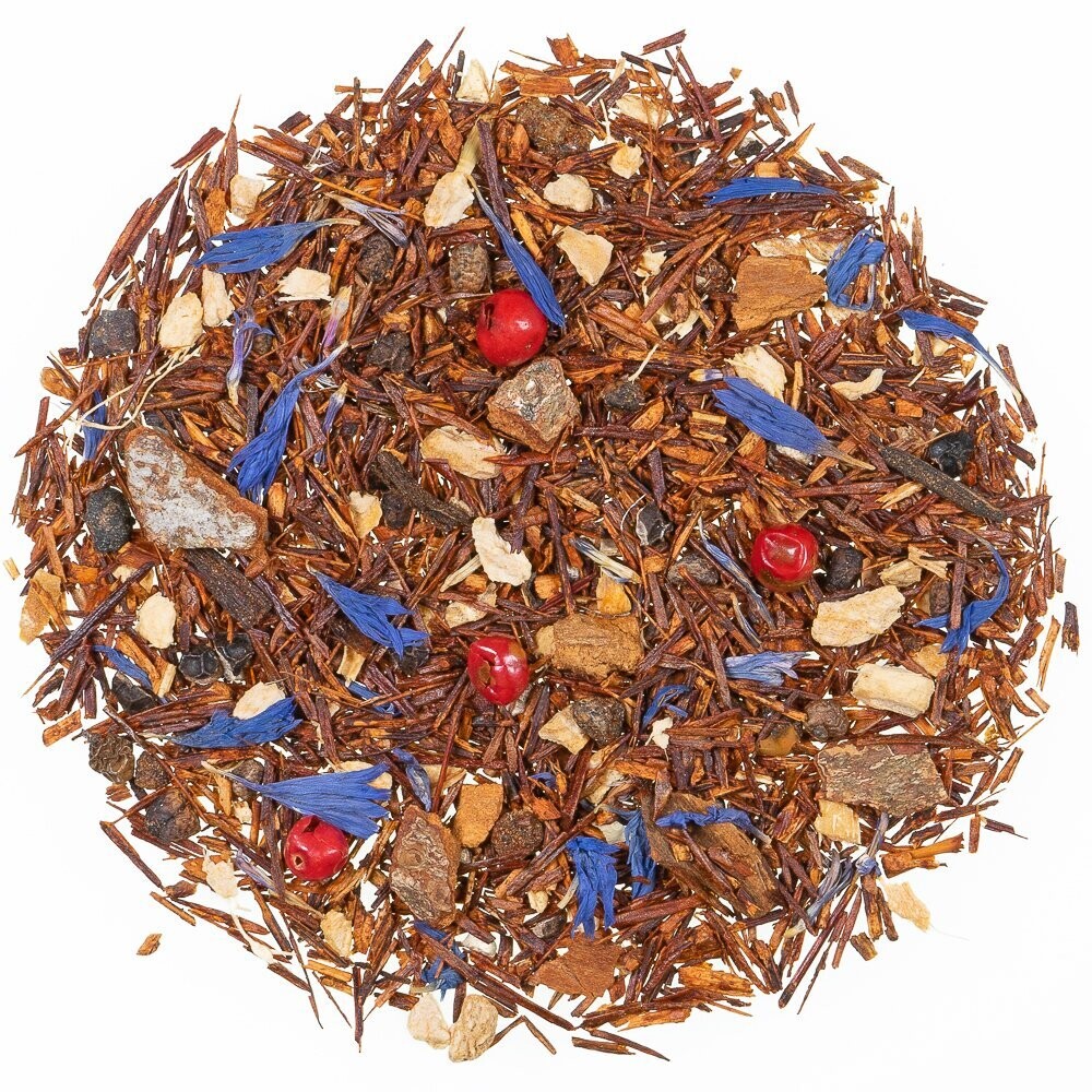 Rooibos, Ingwerstücke, Zimtrinde, Aroma, rosa Pfeffer, Kardamom(4%), Pfeffer geschrotet, Vanillestücke(0,5%), Kornblumenblüten